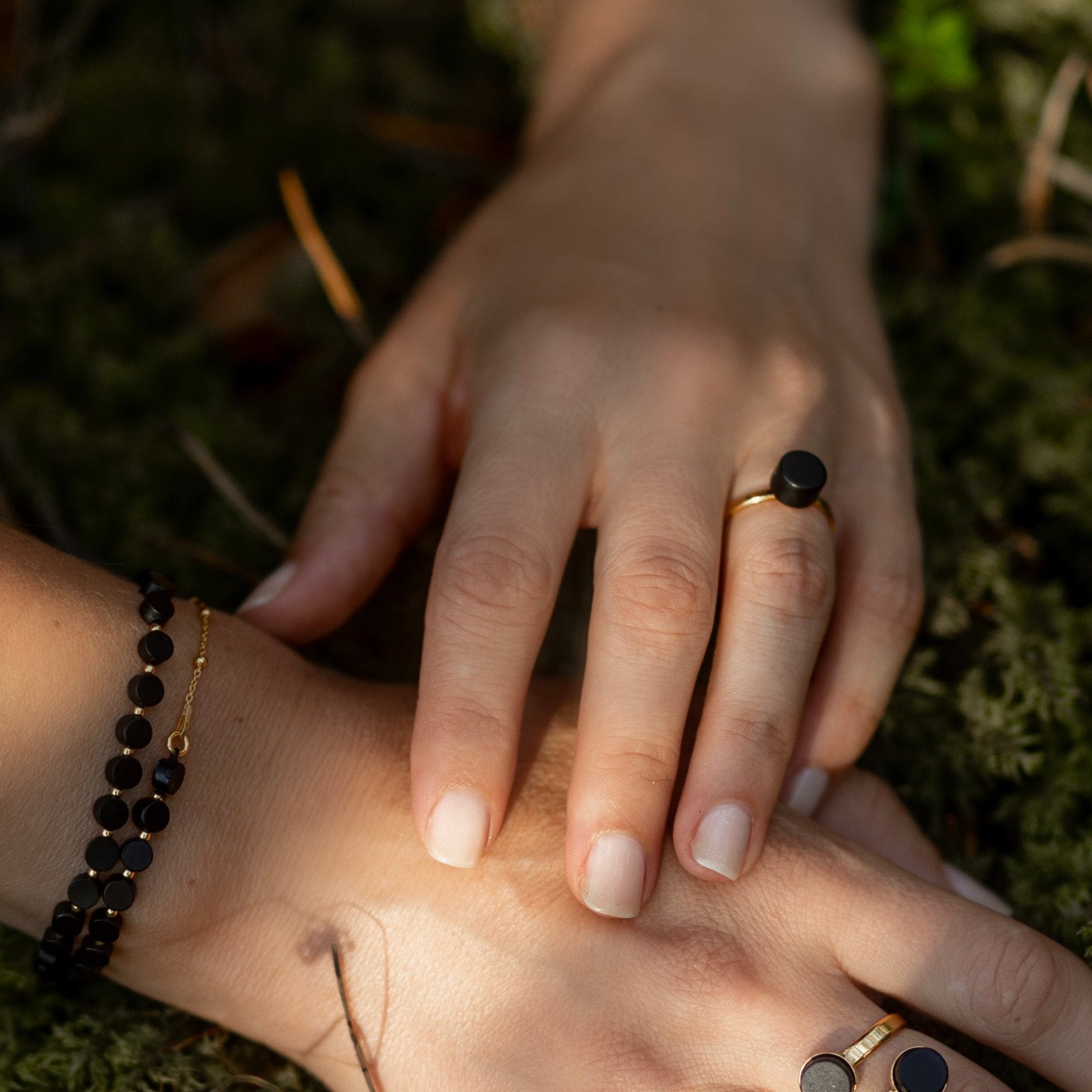 The ring’s design gently combines the matte black amber with warm gold tones, creating a harmonious and stylish blend, perfect for everyday wear or special occasions. This piece perfectly captures the spirit of a modern woman, where fragility meets strength. It’s a ring that will accompany you every day, giving you confidence and subtly reminding you that your beauty lies in your uniqueness.